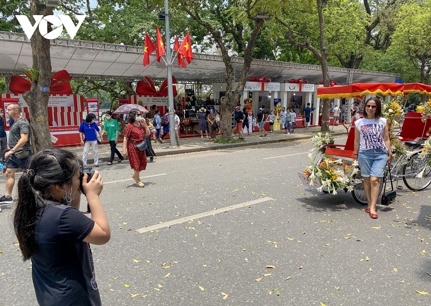 在这里,游客可以观看艺人生产布画、手工刺绣、制作儿童纸玩具等。除了介绍旅游礼品的摊位外,三天节日期间还举办街头艺术表演;河内旅游摄影展等多项文艺活动。