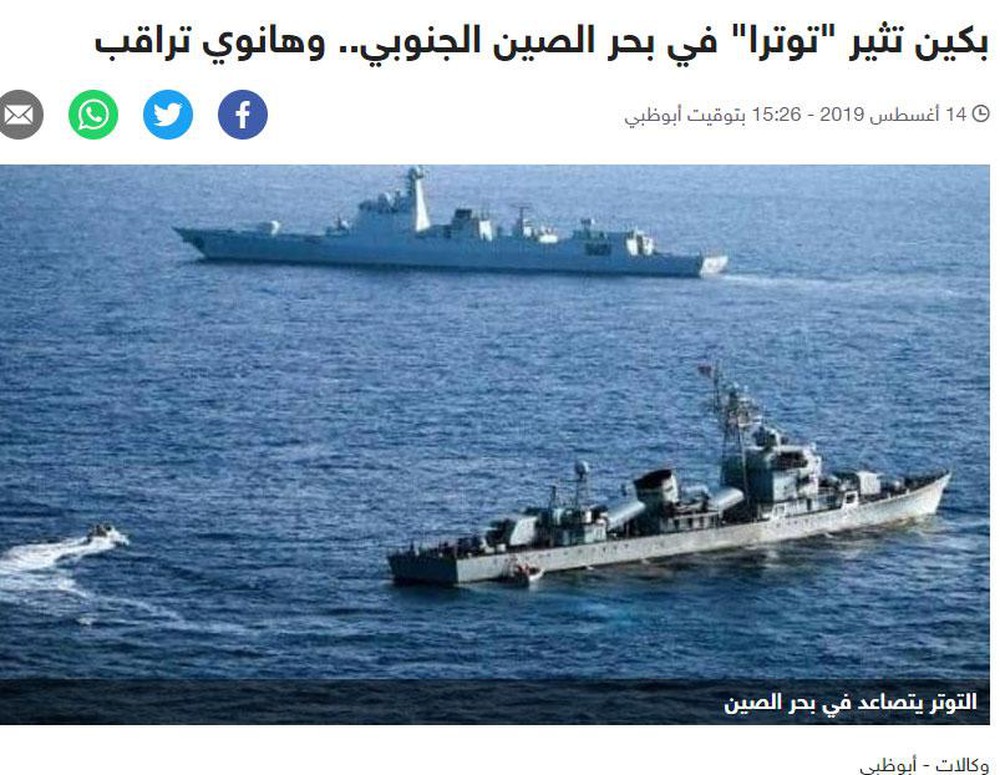 埃及、沙特阿拉伯、阿联酋多个新闻网一律报道,中国船只重返越南海域,侵犯越南海洋主权。这些新闻网也援引越南外交部发言人黎氏秋姮的话表示,越南已经与中国交涉,要求中国立刻终止违法行为,把所有船只从越南海域撤走。