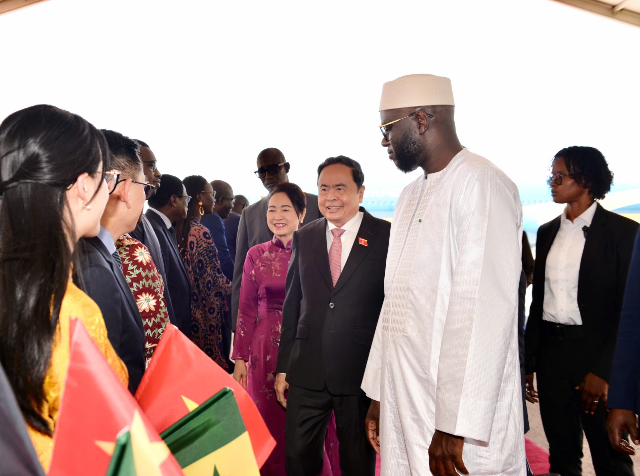 在达喀尔布莱兹·迪亚涅国际机场,塞内加尔国民议会议长马利克·恩迪亚耶、国民议会常务委员会部分成员、越南驻阿尔及利亚兼驻塞内加尔大使陈国庆、使馆工作人员及旅塞越南人代表到场迎接。当地民众以特色传统舞蹈欢迎国会主席陈青敏夫妇及越南高级代表团到访。随后,两国国会主席举行了简短会晤。