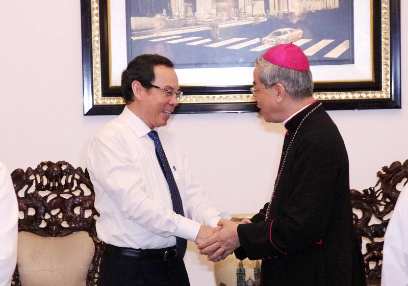 值2022年圣诞节和2023新年之际,21日,胡志明市市委书记阮文年走访胡市总主教府,向总教区总主教、越南主教理事会主席阮能总主教致以祝贺。阮文年感谢总主教、神父、神职人员以及天主教信教同胞与全市人们携手同行,克服困难,取得巨大的社会经济成就。