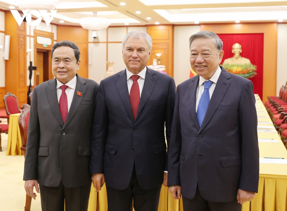 在各场会见和会谈中,苏林总书记、梁强国家主席、范明政总理、陈青敏国会主席强调,越南始终重视与俄罗斯的传统友谊和全面战略伙伴关系,建议俄罗斯国家杜马加强与越南国会的合作与协调,特别是分享“智慧国会”建设经验,完善法律法规,支持两国机关和组织排除困难,推动两国在经贸、投资、能源、科技、教育培训、文化以及人文交流等领域的合作。
