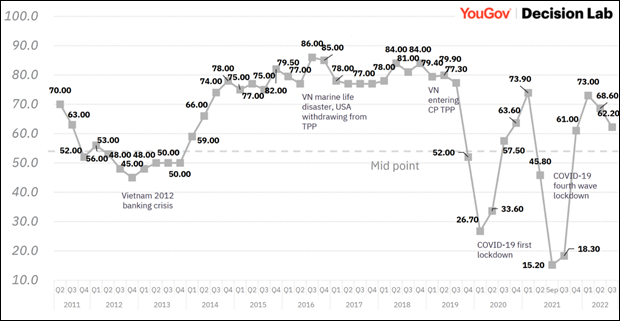 据越南欧洲商会(EuroCham)17日发布的营商环境指数(BCI)的最新结果,今年第三季度,越南经济同比增长13.67%,创历史新高,但营商环境指数连续第二个季度下降,与今年第二季度相比下降6.4个百分点,与第一季度相比下降10.8个百分点。其原因是受到全球经济不稳定造成的影响。对于外国直接投资,42%的受访者预测其公司将在今年年底之前增加对越投资。
