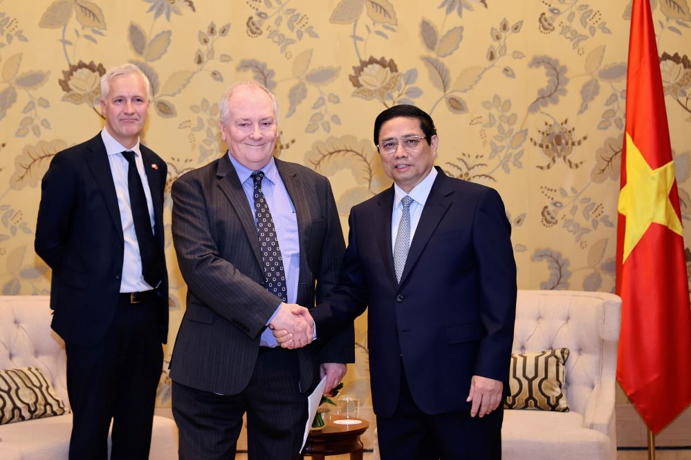 会见中,两位企业领导人分享海上风电和可再生能源开发经验;介绍其企业在越南的投资合作项目,表达为越南到2050年实现净零排放目标做出贡献的愿望。范明政建议两家企业继续配合越南发展可再生能源、风电、太阳能;为越南制定和完善相关战略和制度建言献策;根据规划,制定适当优惠政策并实施具体合作项目。