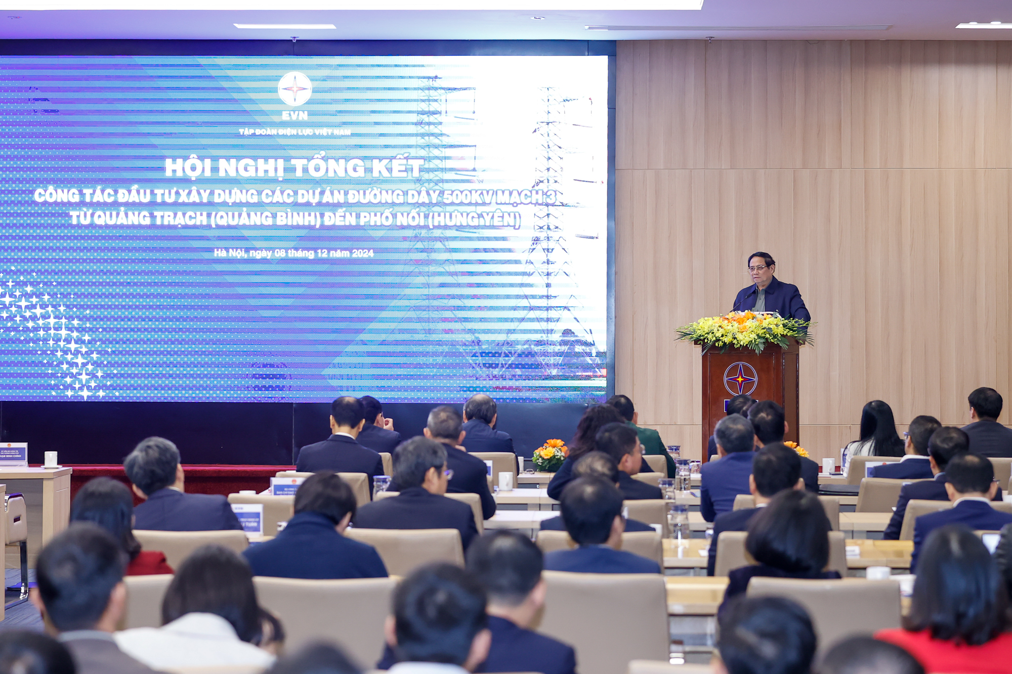 政府总理范明政12月8日上午出席从广平省广泽到兴安省诺街的500千伏第三回输电线路工程建设总结会议。