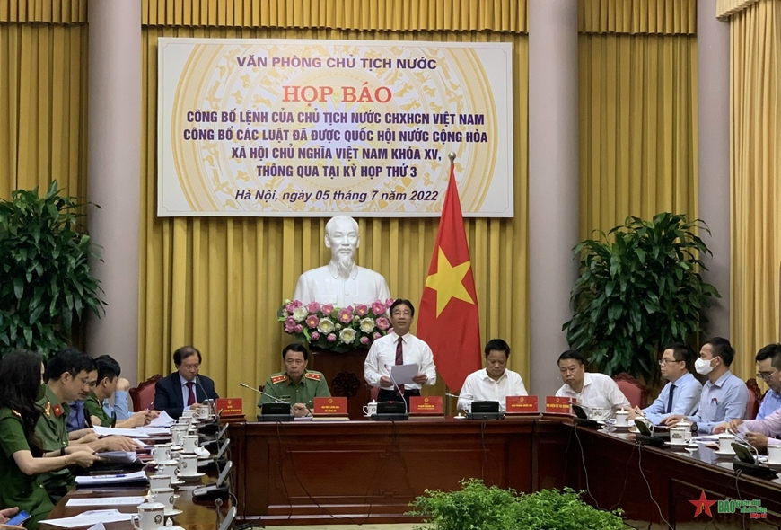 越南国家主席办公厅5日召开记者会,对外公布关于第十五届国会第三次会议通过的5部法律的国家主席令,包括《机动警察法》、《竞赛奖励法》、《电影法》、《保险业务法》和《知识产权法部分条款修改补充案》。 据此,《机动警察法》,自2023年1月1日起施行,共5章33条,为机动警察有效开展工作任务,维护社会治安秩序,满足新时代改革、发展与融入要求提供重要法律基础。