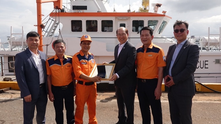 林基泽(右三)向越南海事搜救协调中心第二区人员陈文魁(左三)赠送国际海事组织“海上特别勇敢奖”。 |
