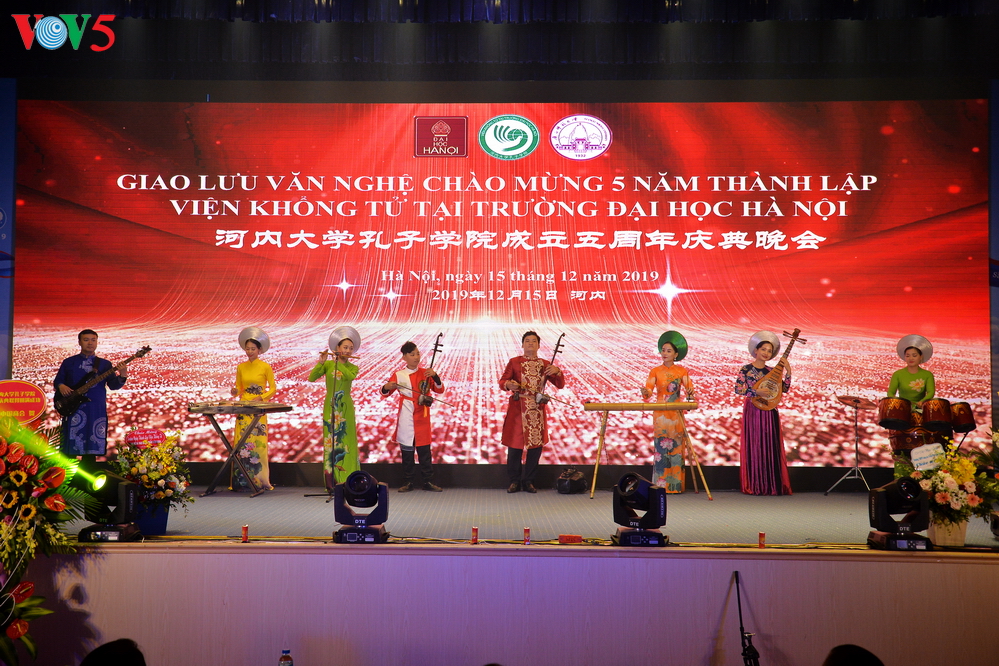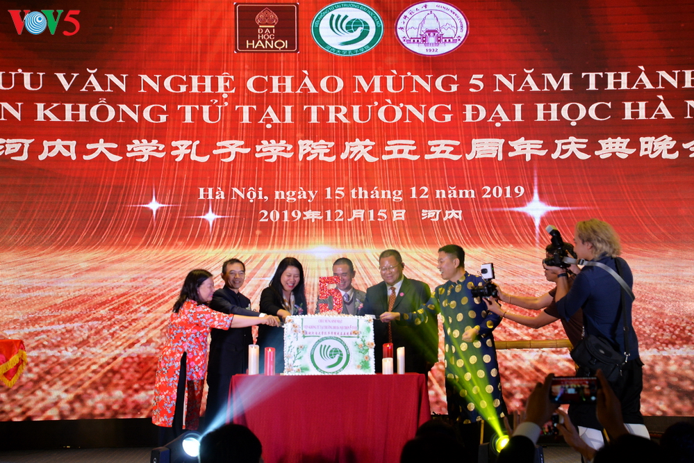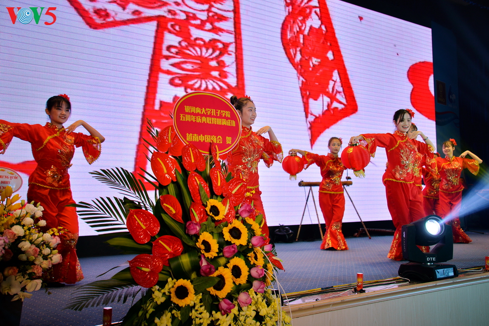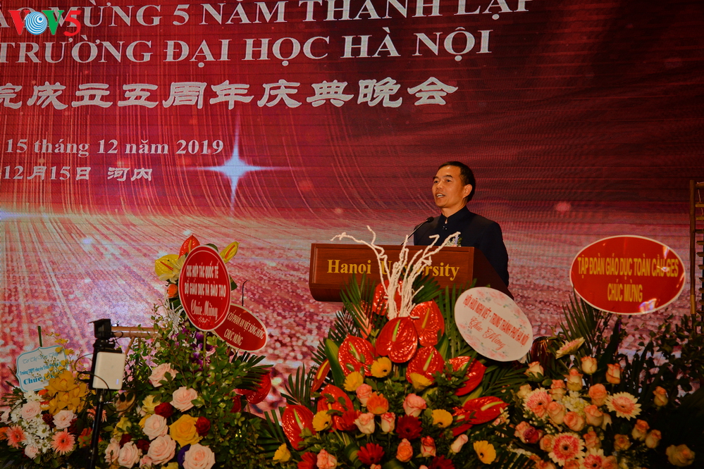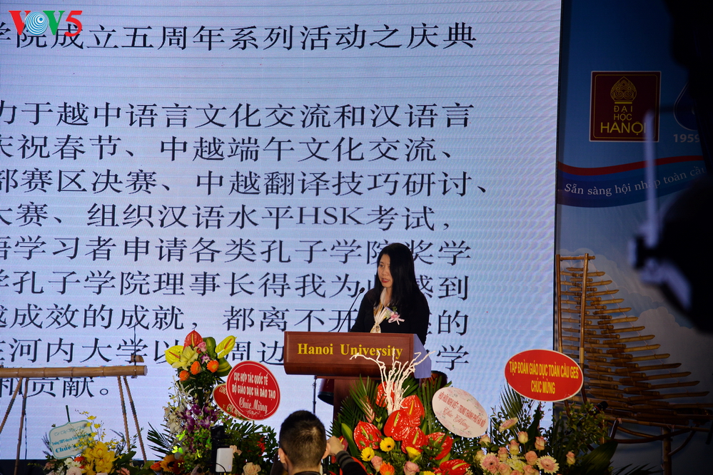 中国驻越南大使馆文化参赞彭世团在庆典上表示:“孔子学院是河内大学与广西师范大学两所大学合作的成果,也是中越两国教育界合作的成果。今天我们在这里庆祝孔子学院成立5周年,这是总结过去,展望未来的一个很好的契机。我们希望通过大家的共同努力,能够使孔子学院成为两国教育合作的平台,从这里出发走向越南全国,而在这个平台上,通过大家的努力与合作,能够促进中越两国友好关系发展。”