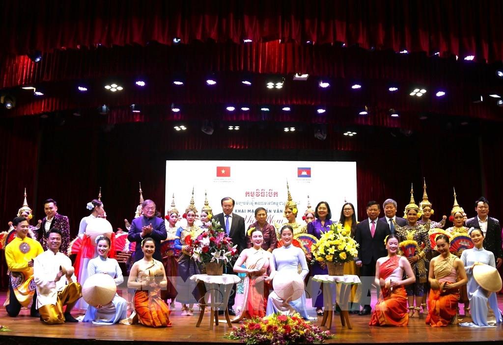 在开幕式上,柬埔寨官员、各国驻柬使节以及越侨等众多代表共同欣赏了越南越北民间歌舞艺术团的精彩演出。