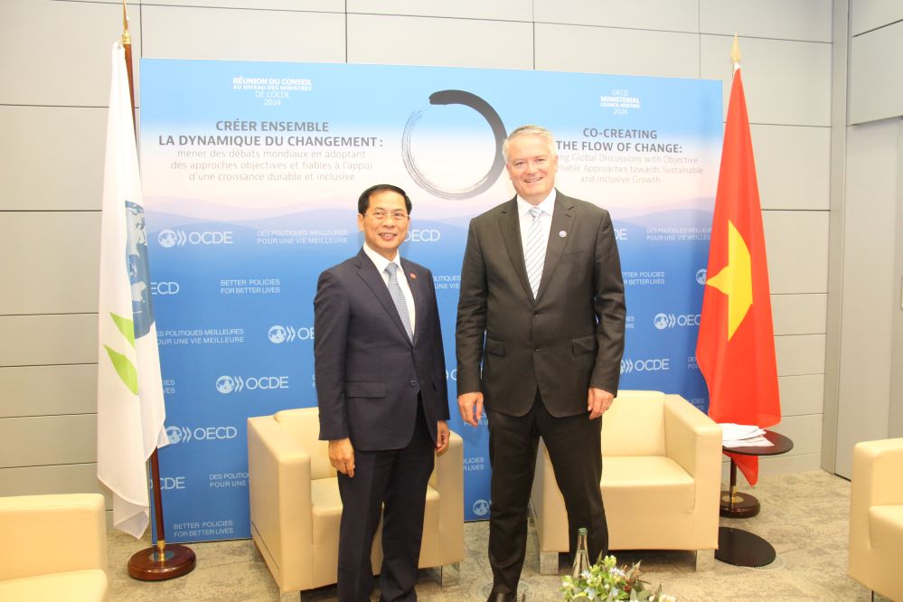 (VOVWORLD) - 在法国巴黎出席经合组织部长理事会(MCM)会议期间,越南外交部长裴青山5月2日会见了经合组织秘书长马蒂亚斯•科尔曼(Mathias Cormann)。