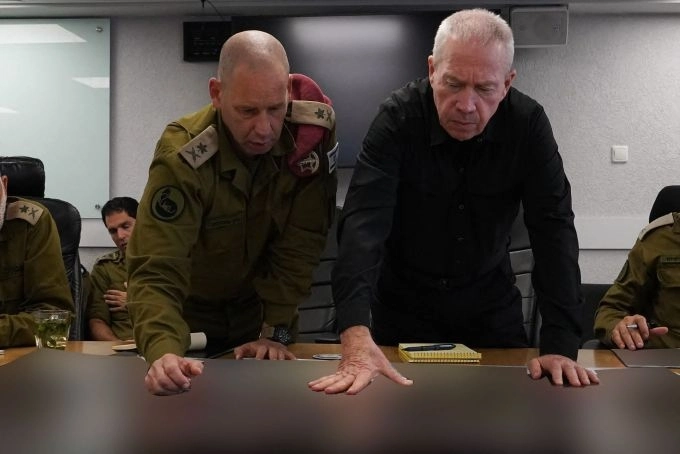 以色列国防部长加兰特(右)10月19日看望部署在加沙边境附近的以色列士兵。图片来源:AFP。 |