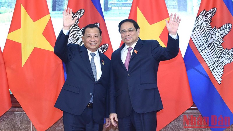 10月25日上午,在政府总部会见柬埔寨王国参议院主席赛宗时,越南政府总理范明政建议双方进一步提高经贸投资合作效率,互相帮助建设独立自主、能够抵御外部冲击的经济,继续在软硬基础设施方面对接两个经济体;建议双方继续努力推动两国未定边界勘界立碑,进而建设和平、友好、合作、发展的边界线。