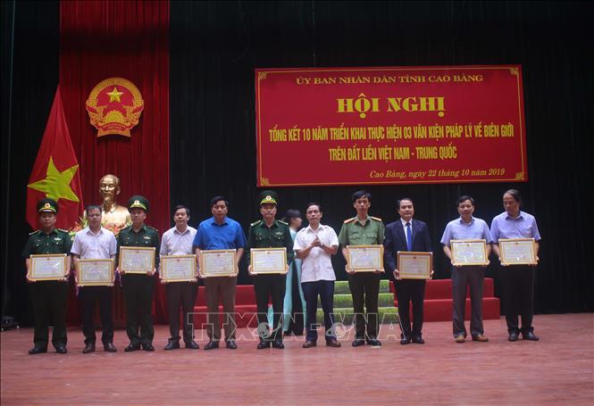 值此机会,高平省人委会主席向在越中陆地边界三项法律文件实施10年过程中表现突出的20名个人和集体颁发奖状。(完)