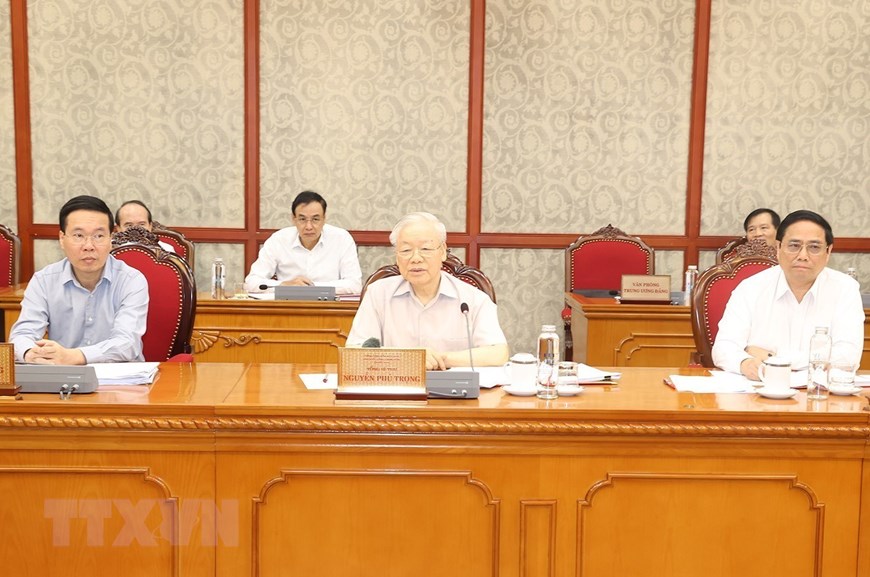 越共中央总书记阮富仲21日在越共中央总部主持召开中央政治局和书记处会议,讨论政府党组干事会关于2023年上半年经济社会形势、2023年下半年任务部署的报告。