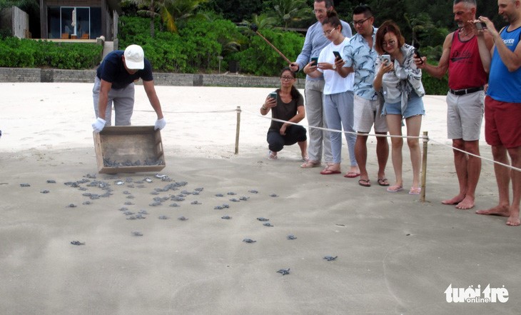 游客在昆仑岛上观看将小海龟放归自然的过程。 |