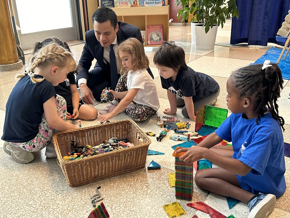 值此之际,越南外交部常务副部长阮明武和越南常驻联合国代表团团长邓黄江大使以特别嘉宾身份应邀与幼儿园学童一起出席了“寓教于乐”活动。