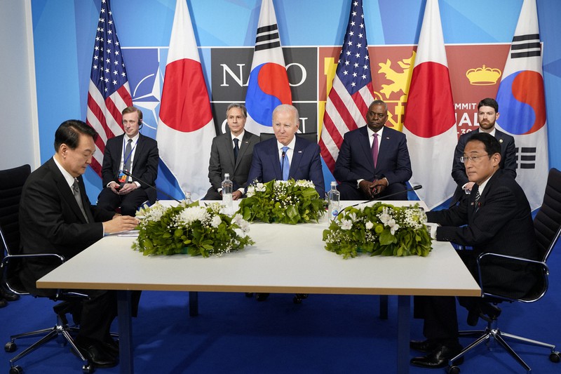 美国总统拜登、韩国总统尹锡悦和日本首相岸田文雄6月29日在西班牙马德里北约首脑会议范围内举行三方会谈。
