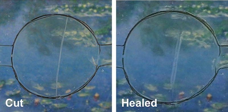研究人员对材料进行了切割、划痕等多项测试,以证明其自我修复能力。结果显示,化学家们将材料撕成两半后,在24小时之内,材料就会自动合到一起。