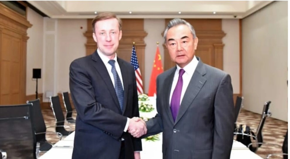 美国国家安全顾问沙利文(左)与中国外长王毅。图片来源:中国外交部。 |