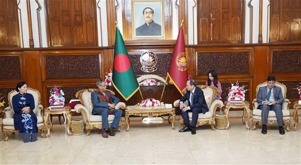 递交国书仪式结束后,孟加拉国总统穆罕默德·沙哈布丁会见了阮孟强大使。穆罕默德·沙哈布丁高度评价越南经济社会发展成就,并希望两国推进各领域的双边合作关系,为孟加拉国纺织品、药品等重点产品出口越南创造有利条件。
