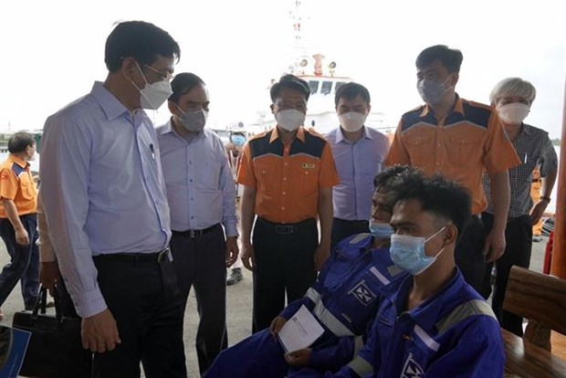越南交通运输部副部长阮春创(左)看望慰问遇险船员 |