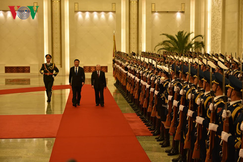 (VOVworld)- 欢迎越共中央总书记阮富仲一行对中国进行正式访问的仪式1月12日下午在北京人民大会堂隆重举行。中共中央总书记、中国国家主席习近平主持仪式。