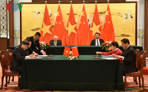 当天下午,阮富仲与习近平共同出席了两国15项合作文件的签署仪式。随后,习近平邀请阮富仲出席在人民大会堂举行的茶叙。这是前所未有的特别举措,体现了中国领导核心对增进与越南最高领导人的感情与互信的重视和诚意。