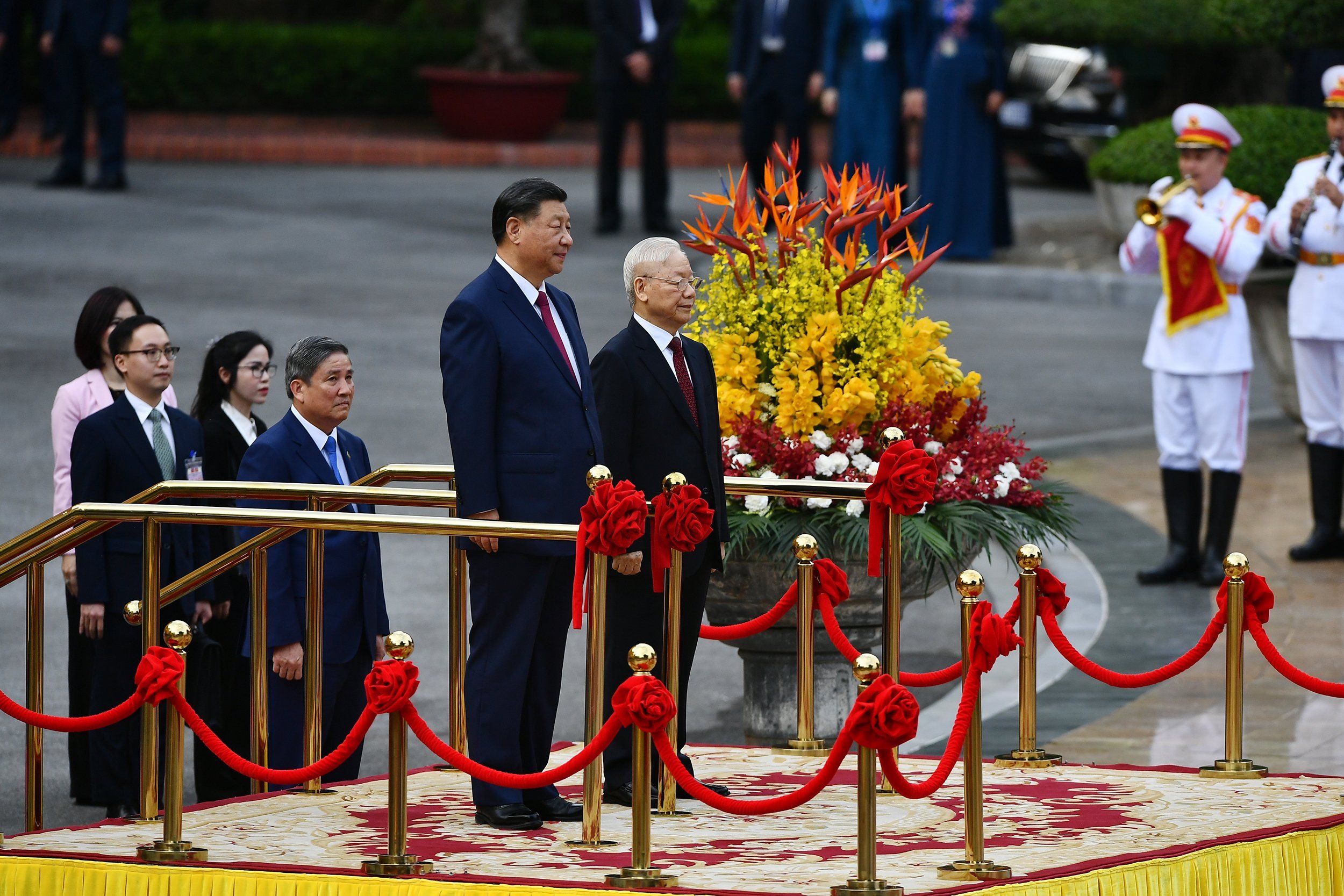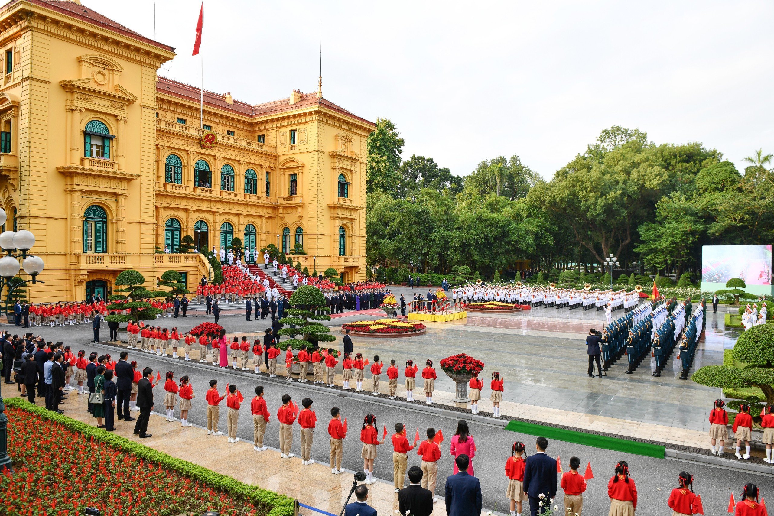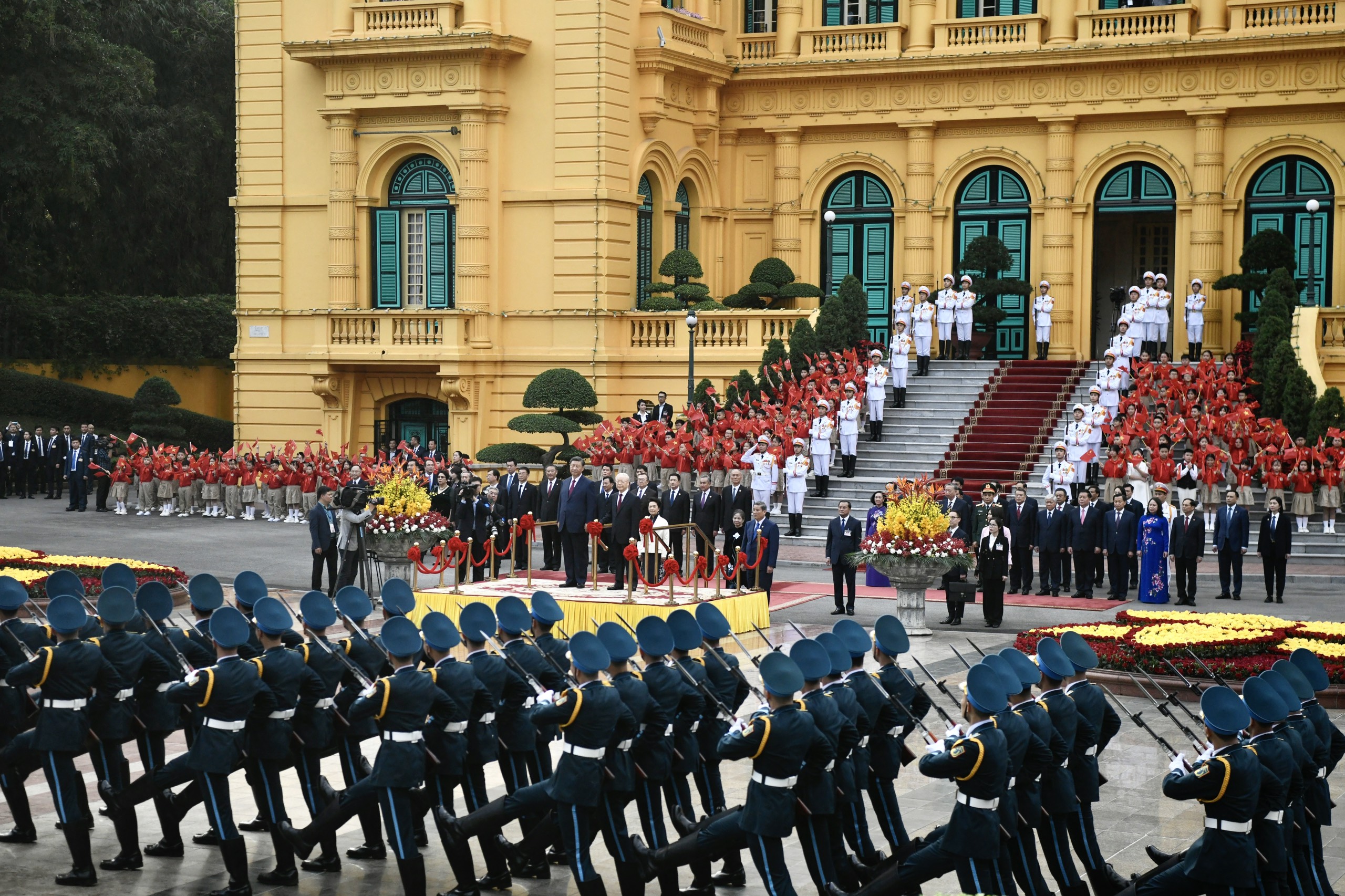 (VOVWORLD) -12日下午在首都河内主席府,越共中央总书记阮富仲和夫人主持仪式,欢迎中共中央总书记、国家主席习近平和夫人对越南进行国事访问.
