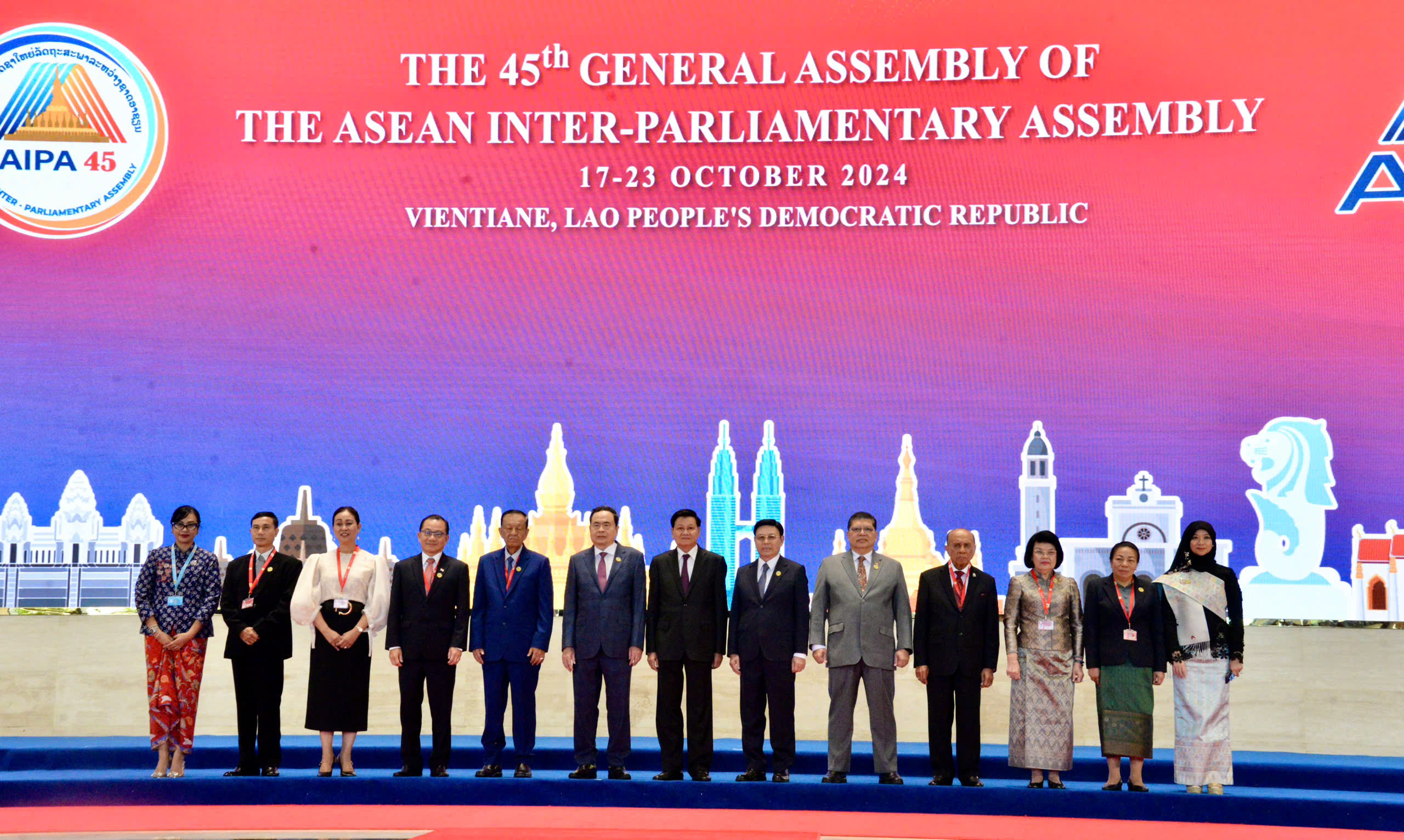 出席第45届东盟议会联盟大会的各国代表团团长合影。 |