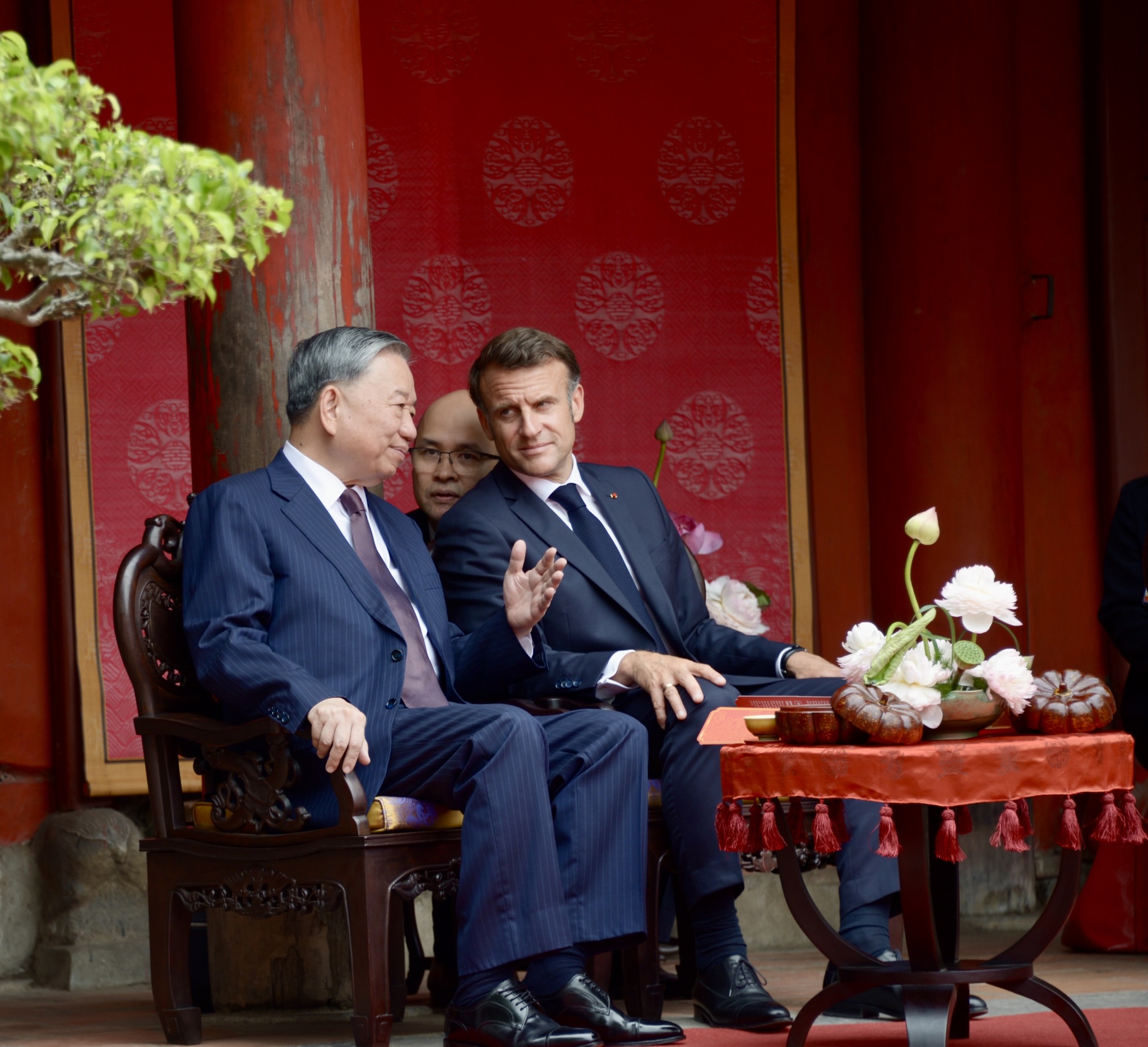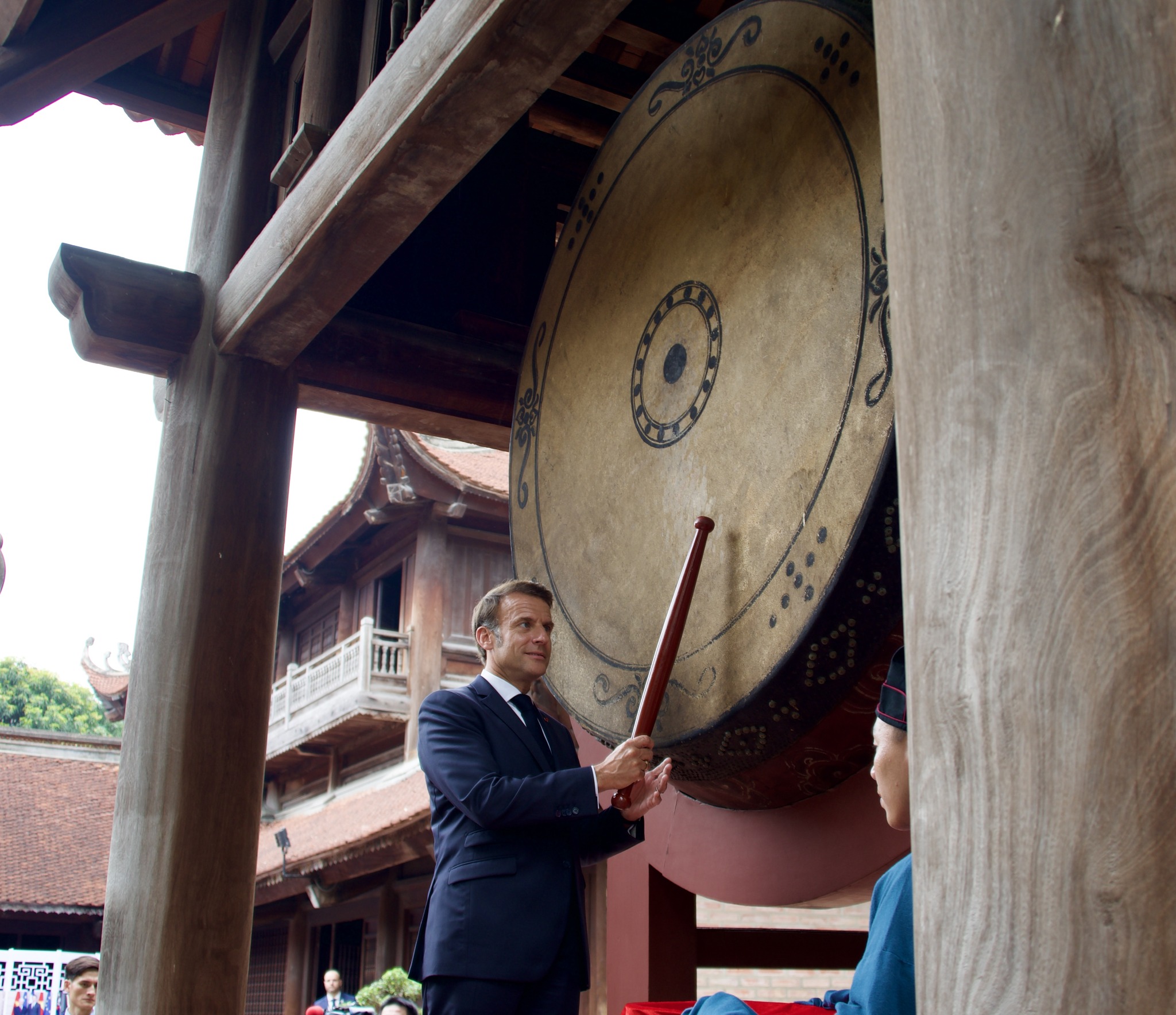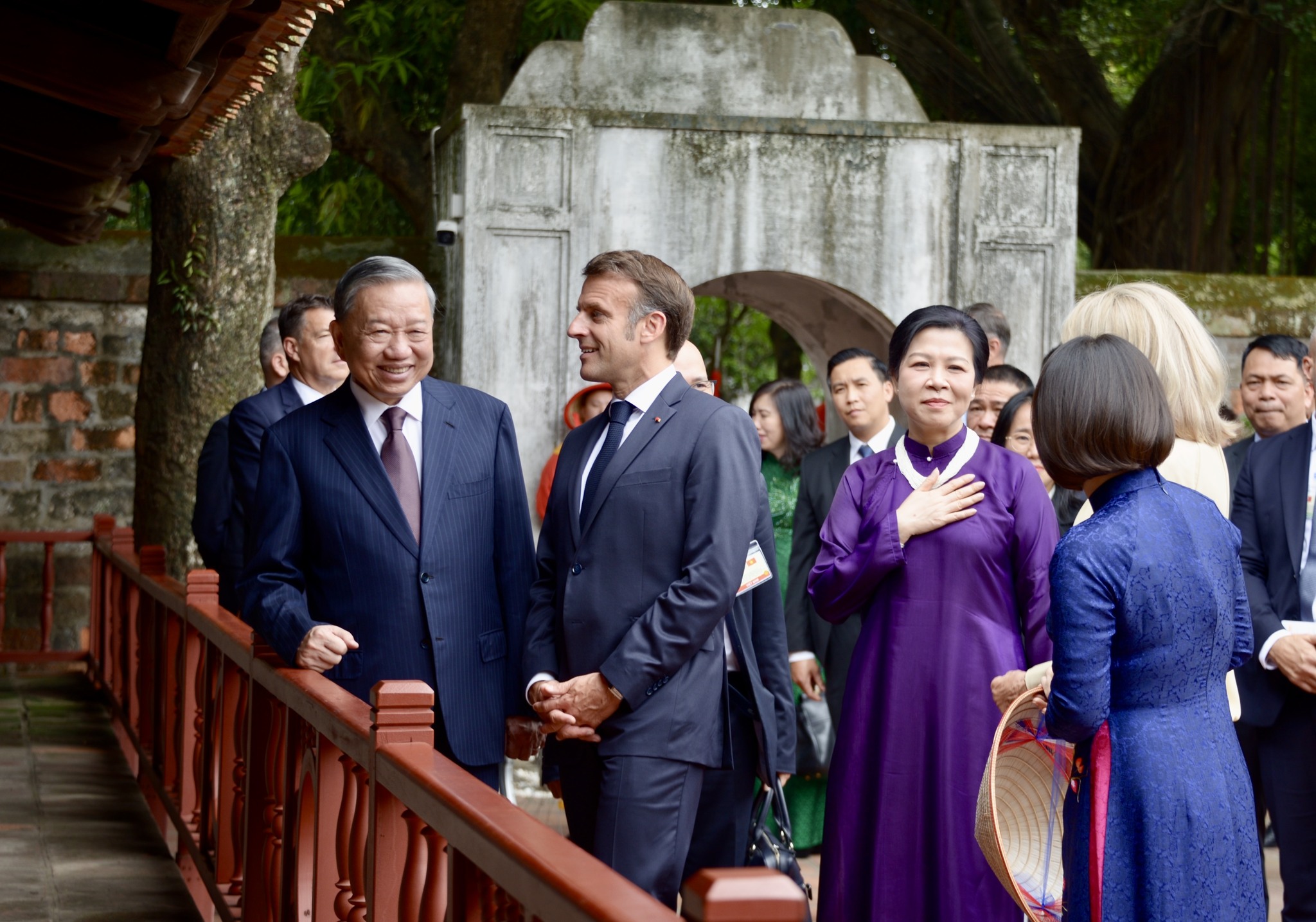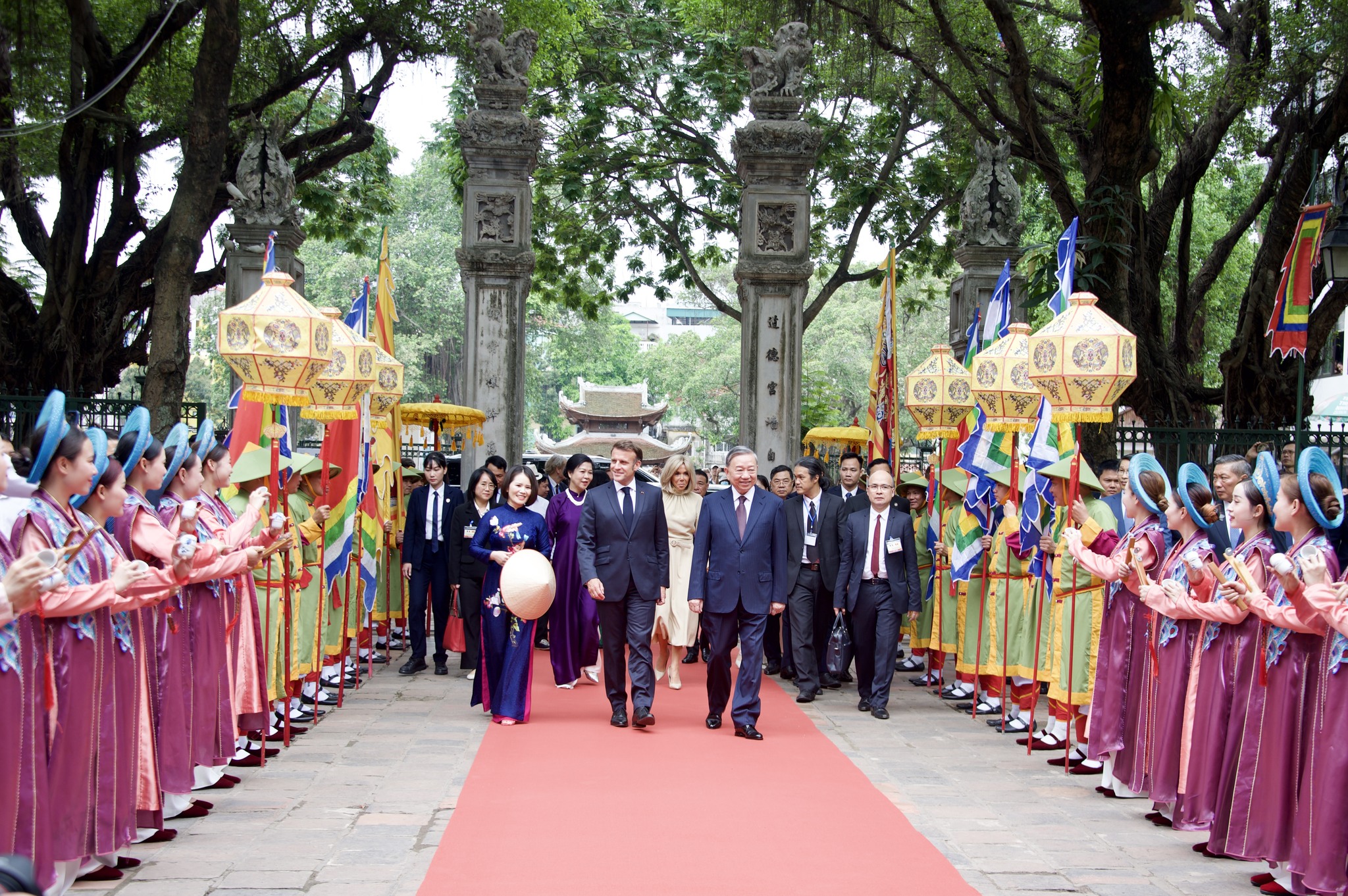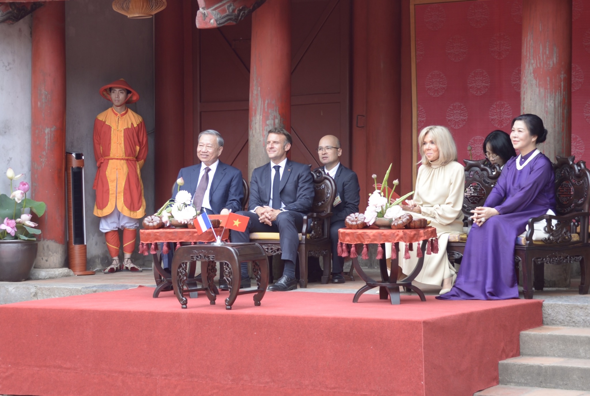 随后,苏林总书记和夫人与法国总统埃马克龙及夫人参观了古建筑群,包括:大中门、大成殿、进士碑园;了解这个保存和弘扬道学、保存和最精彩呈现越南文献突出价值的地方;在禅光井旁欣赏了水上木偶戏表演,在文庙正院观看了顺化宫廷雅乐演奏,欣赏了富有越南文化特色的民歌。法国总统马克龙在文庙-国子监行击鼓礼;观看了反映两国关系重要时刻的图片展。