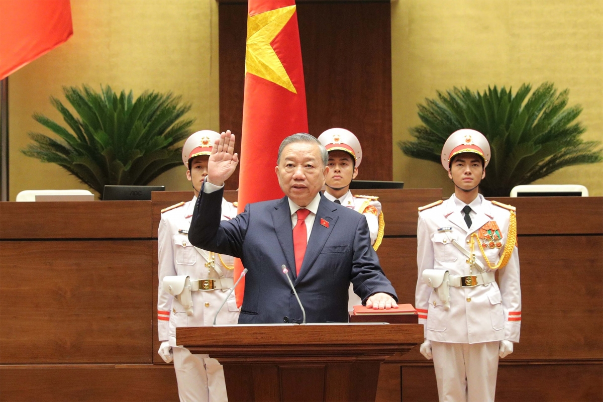 4月7日上午,在越南首都河内,第十六届国会以495名与会代表全部赞成的结果,通过了关于选举越共第十四届中央委员会总书记、第十六届国会代表苏林为越南社会主义共和国主席的决议。当选后,苏林总书记、国家主席宣誓就职。