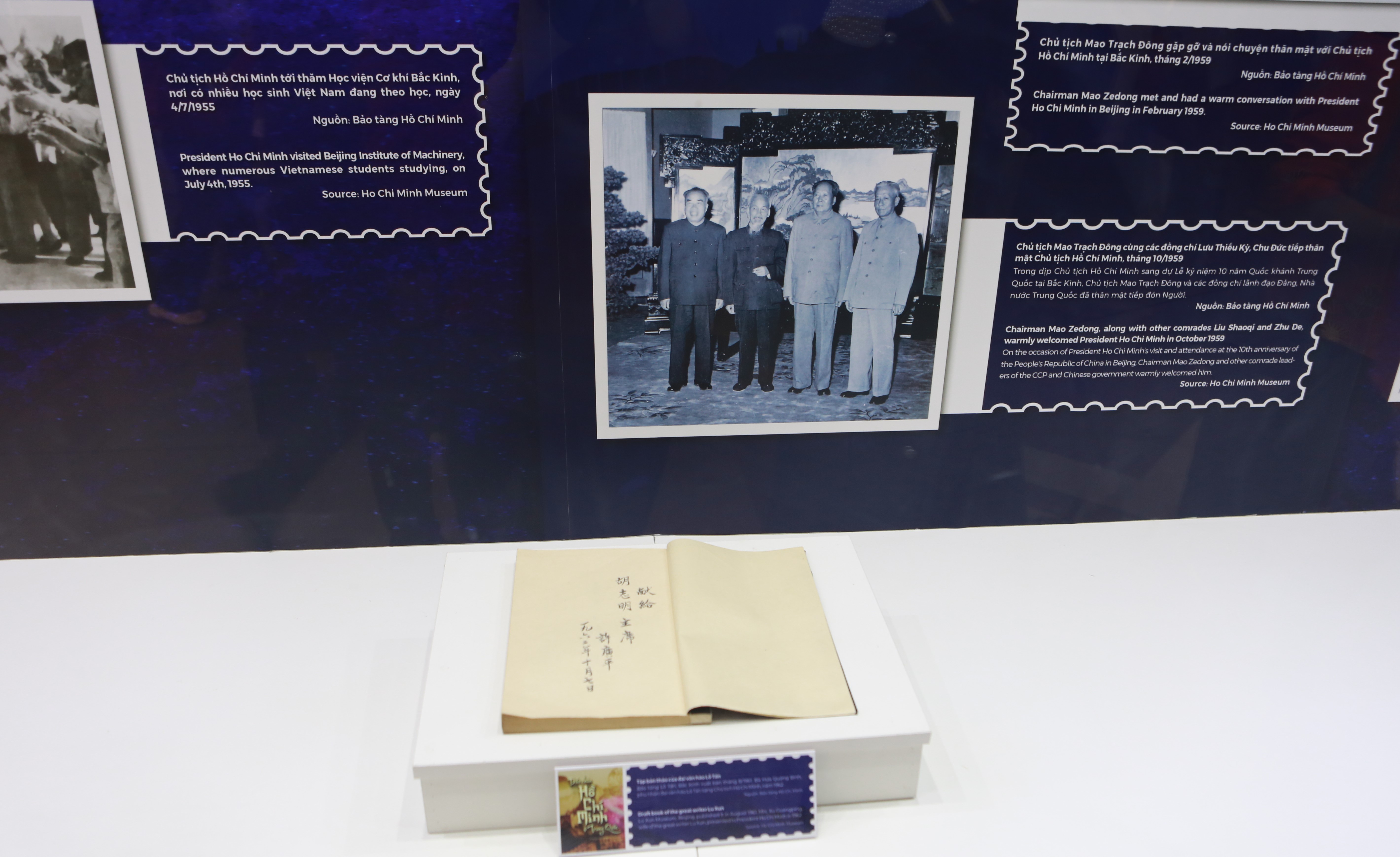 河内工业大学学生梁月英表示,胡志明主席在华期间的活动对越南革命运动产生了巨大影响,同时肯定两国将为年轻一代培育越中友谊。她分享说:“胡志明主席和毛泽东主席长期以来建立了“同志加兄弟”的友谊。通过教育、文化、经济、贸易和旅游等活动,两国一代又一代大学生共同培育和发扬这一友谊”。 以下是“胡志明主席在中国的足迹”资料展的一些实物和图片: