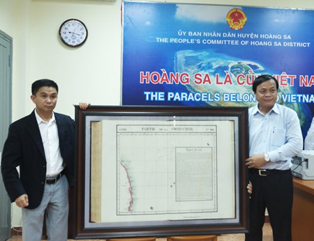 | 岘港市黄沙岛县代表接收陈胜(左)捐赠的珍贵黄沙地图 |