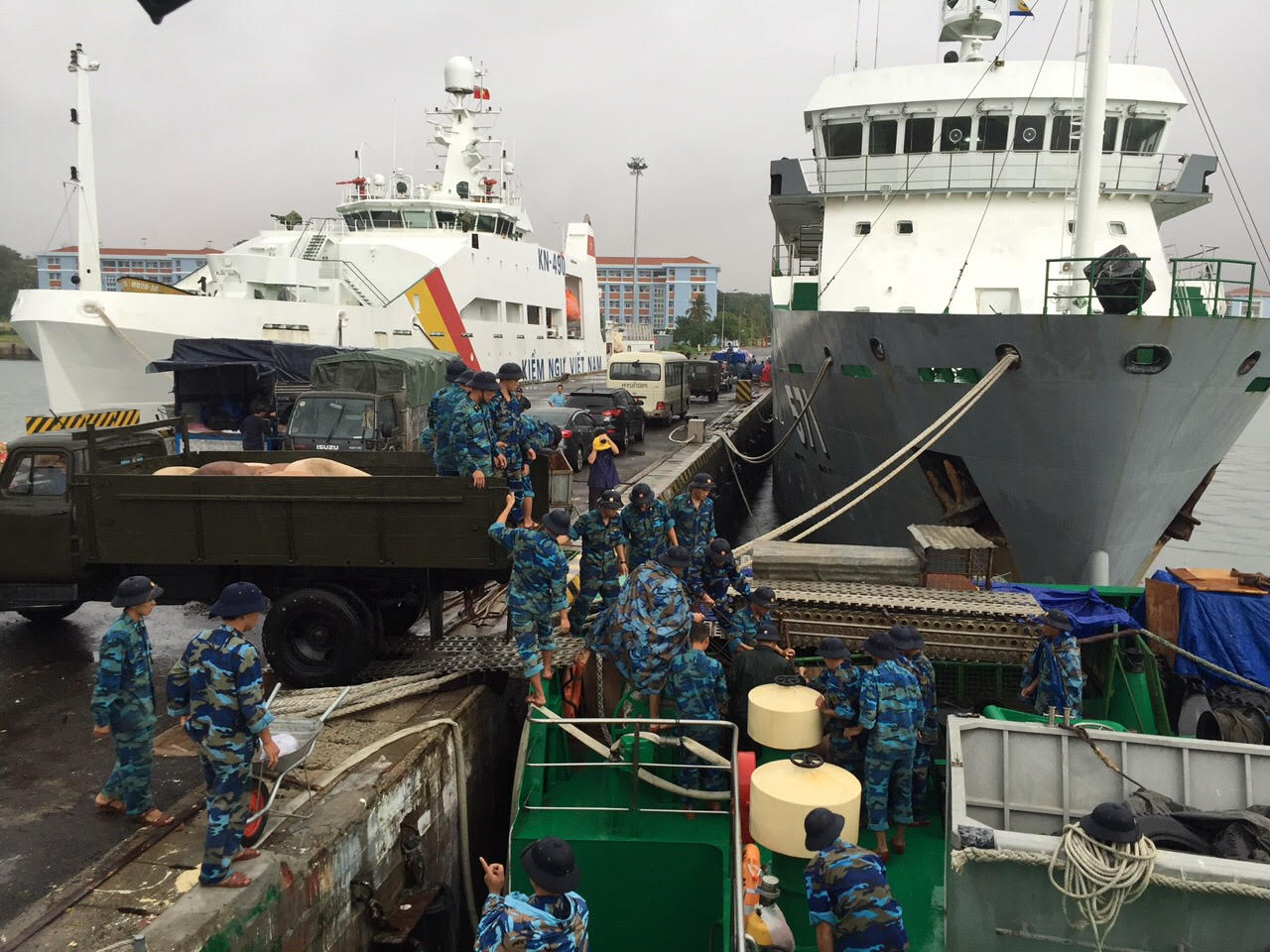 (VOVworld)-20日,搭载有关部门、团体组织组成的工作代表团的三艘货轮从金兰港启程前往庆和省长沙岛县向岛上驻军战士、干部和居民拜年。