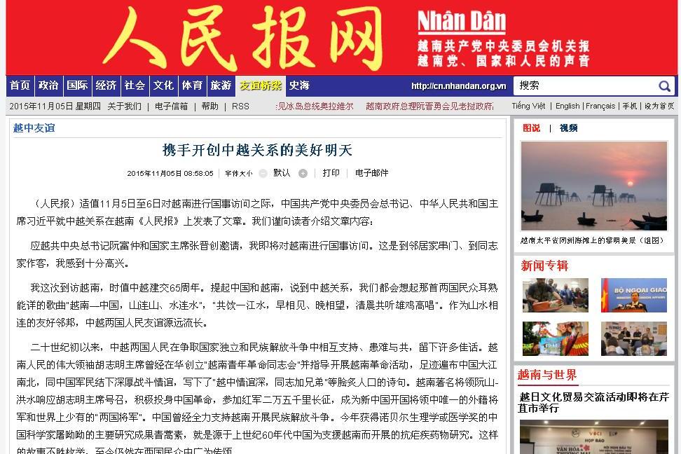 | 《人民报》中文网发表《携手开创中越关系的美好明天》的文章 |