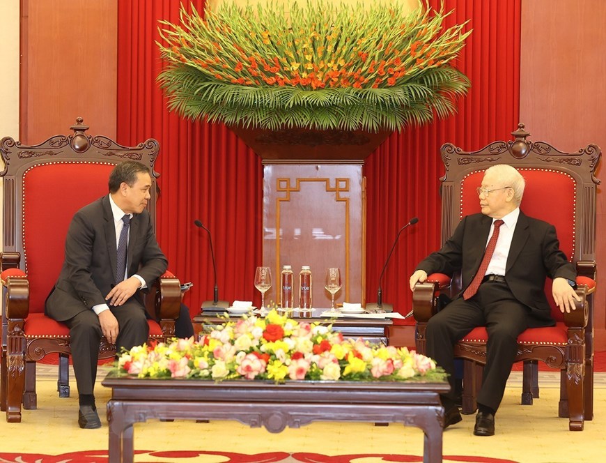 越共中央总书记阮富仲(右)会见老挝驻越南大使森菲特·宏本让。 |
