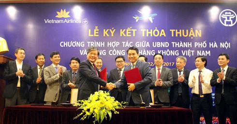 | 河内市人民委员会主席阮德忠与越南航空总公司董事长范玉明签署合作协议 |