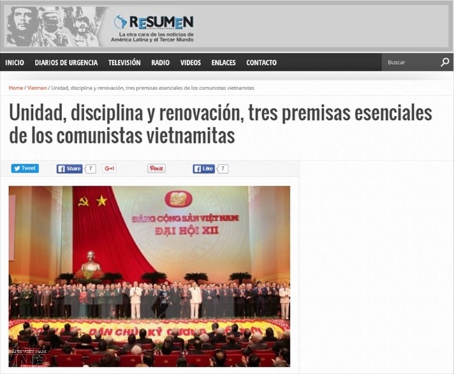 (VOVworld)- 阿根廷《拉丁美洲综述》2月1日期刊登该报总编卡洛斯•阿斯瓦雷斯发表的题为《团结、纪纲和革新——越南共产主义者的三个基本前提》的文章,高度评价越共12大取得的成功。