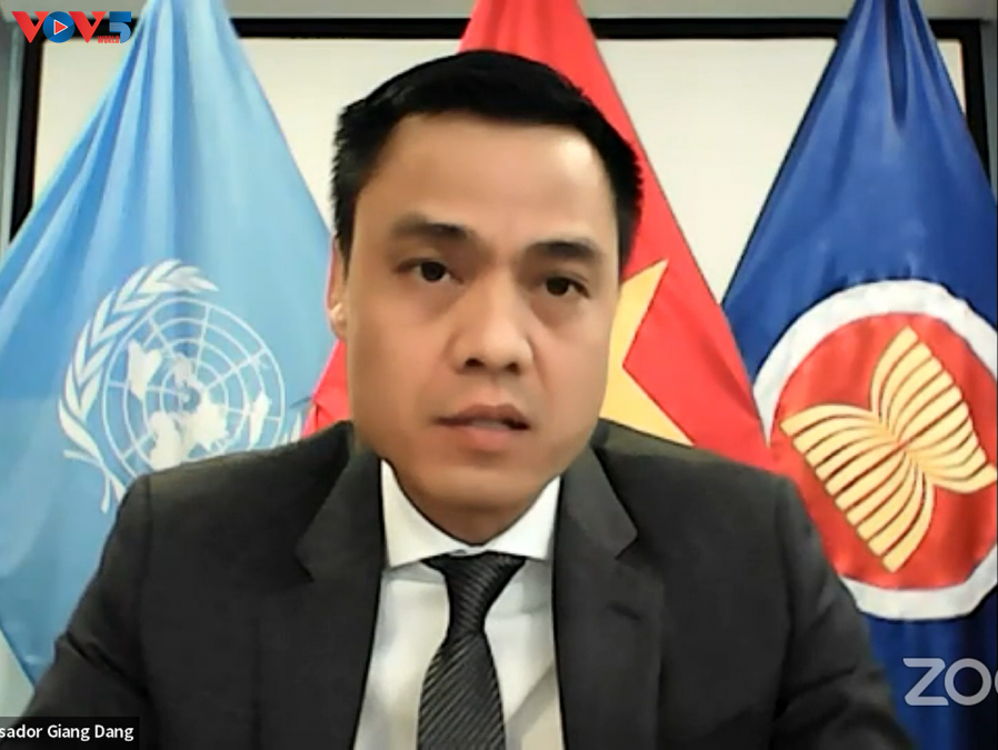 越南常驻联合国代表团团长邓黄江在会上发表讲话强调,若没有和平,可持续发展目标就无法实现,而先决条件是为疫情后复苏与发展营造和平、稳定环境。为实现上述目标,要倡导和平、合作、透明、开放、包容、平等、互利精神,尊重联合国宪章和国际法。