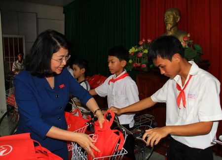 (VOVworld) - 越南国家副主席邓氏玉盛、越南儿童保护基金代表和援助者8月9日向永隆省龙湖县小学和初中的贫困好学学生赠送30辆自行车和每份100万越盾的100份助学金。