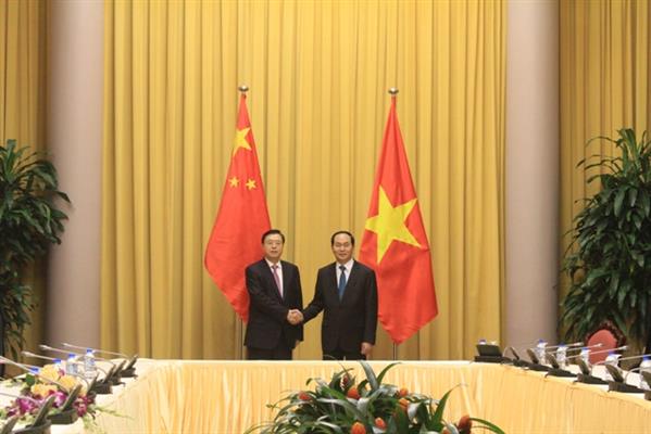 (VOVworld)- 越南国家主席陈大光11月9日在主席府会见中国全国人大常委会委员长张德江时强调,越南一向重视与中国发展稳定、健康、持续的关系。不断加强越中友好关系和两党、两国及两国人民的互利合作是两国发展中的重要因素,为世界和地区的和平、稳定与发展做出积极贡献。
