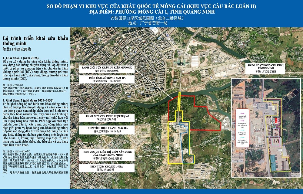 广宁省口岸管理委员会副主任邓明尊表示: “在北仑一号桥区域,将扩大口岸的范围和边界,加大对出入境和海关清关空间及面积的投资,并增加自动化管控流程。北仑二号桥区域将实行智慧口岸模式,增加专用通道数量,并采用自动驾驶车辆模式或建设单轨货运模式,提升进出口通关能力。我们还与中方协调,研究和建设支持智慧口岸运行的跨境基础设施。”