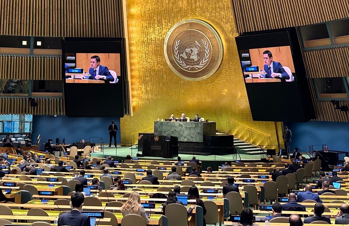 越南常驻联合国代表团团长邓黄江大使以联大副主席身份共同主持会议,并以越南国家代表身份发表了讲话。邓黄江呼吁国际社会基于尊重《联合国宪章》和国际法,共同努力实施可持续发展目标、2030 年议程和其他全球承诺和优先事项。