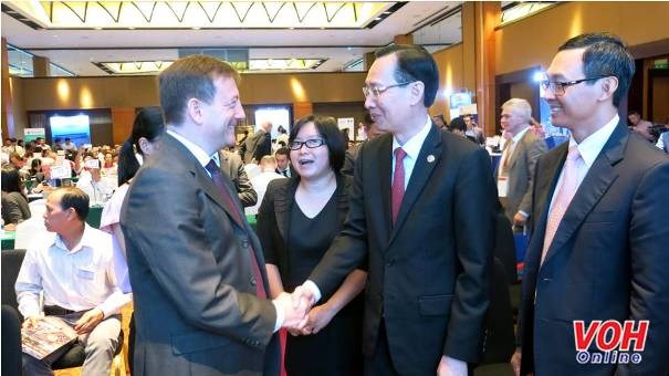 | 出席论坛的胡志明市领导与法国驻越大使。图片来源:VOH |