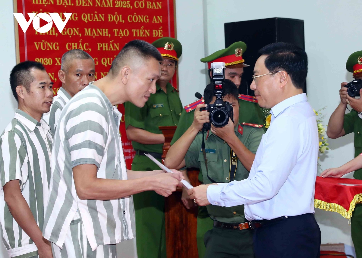 仪式上,范平明和荣光监狱管委会代表向包括5名外国人在内的71名犯人颁发国家主席特赦决定。范平明在仪式上指出,继承和发扬越南民族人道主义传统美德,落实党和国家宽大政策,数十万犯人获得特赦,重返家庭怀抱,重新融入社会。