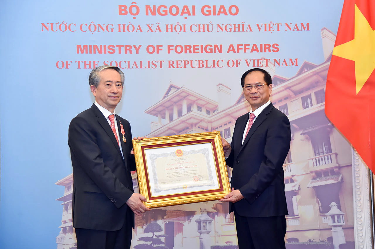 值此之际,受越南国家主席苏林之托,裴青山向熊波授予越南国家友谊勋章,表彰他为推动越中全面战略合作伙伴关系所做出的积极和有效的贡献。