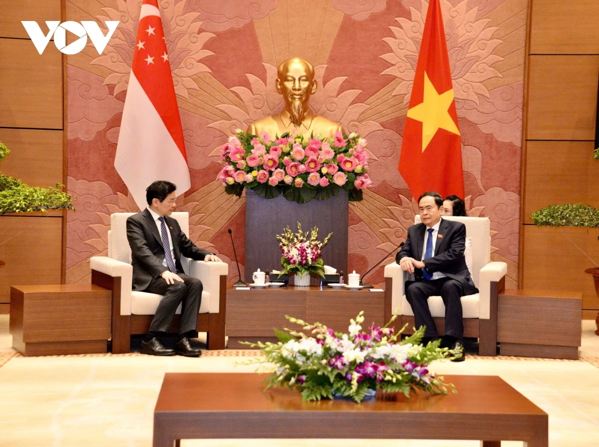 当天下午,越南国会主席陈青敏在河内国会大厦会见了新加坡总理黄循财。陈青敏表示,越南国会和新加坡国会都在积极、有效配合,共同落实好双方于2022年5月签署的合作协议,以及国会主席陈青敏2024年12月访问新加坡期间,双方达成的共识。两国国会一致同意在各国议会联盟(IPU)、东盟议会联盟(AIPA)等国际和地区议会论坛上进行磋商并相互支持。