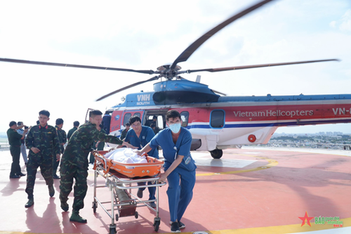 (VOVWORLD) - 7月31日下午,18兵团的VN-8619号直升机降落在175军医院创伤骨科大楼停机坪,把在庆和省长沙岛县两名重症患者安全送回陆地。