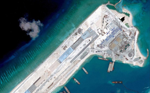 | 中国在越南长沙群岛十字礁上非法建设的飞机跑道 图片来源:路透社 |