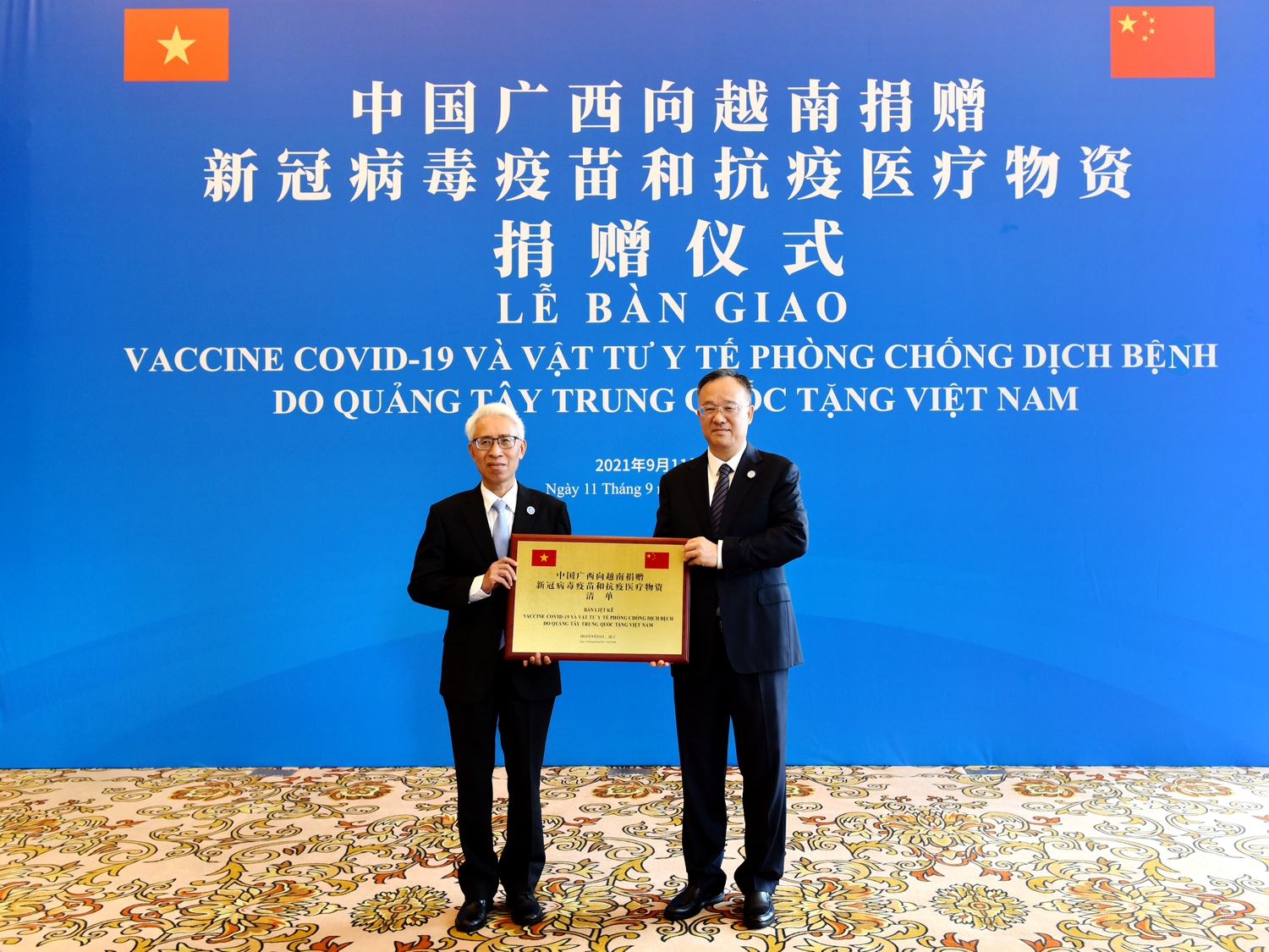 本着上述精神,广西决定向越南各地赠送总值为970万美元的医疗物资,其中包括80万剂中国国药疫苗。越南驻中国大使范星梅感谢广西壮族自治区政府和人民向越南各地提供的及时和宝贵帮助,同时强调这是双方传统友谊的生动体现,相信广西壮族自治区政府和人民提供的援助将为越南疫情防控工作作出积极贡献。
