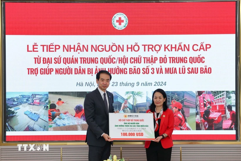 越南红十字会中央委员会23日在河内举行仪式,接受中国驻越南大使馆,中国红十字会向受台风“摩羯”及其环流影响的越南民众提供的10万美元紧急援助。